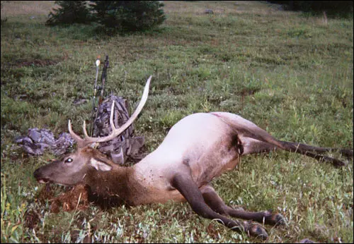 "Ya'll asked me to send photo's. Well here is my first Elk ever with a bow. Got him last Tuesday around 19:00. I am very thankful I was using the Silver Flame XL 125 Grain broadheads. He did not run far, about 70 yds. Shot him at 45 yds broadside. Great product!! Went right through the elk and punched out a rib on the other side. Thanks again for the help in acquiring the Silver Flame broadheads."Dwain F. Hudson Jr.
